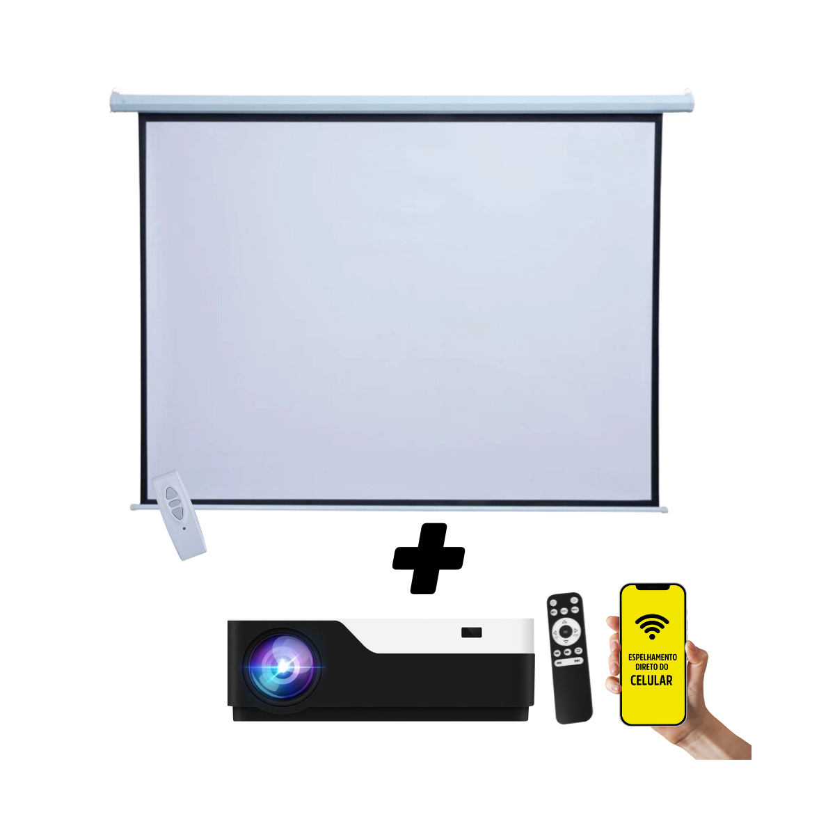 Kit completo para apresentações profissionais, salas de reunião, igrejas, escolas e home cinema. Combina tela de projeção elétrica com projetor Full HD de alto brilho, oferecendo excelente qualidade de imagem e fácil instalação.
